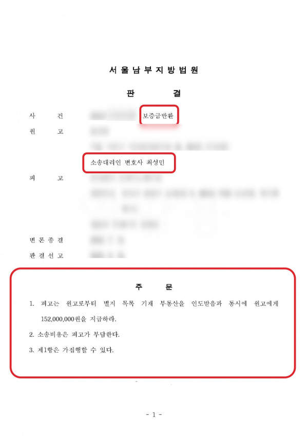 신속한 진행 덕분에 소송을 제기한지 3개월 만에 승소 판결을 받을 수 있게 되었습니다. 판결문을 근거로 임대인에 대한 신용조회 및 강제집행절차를 진행할 예정입니다.