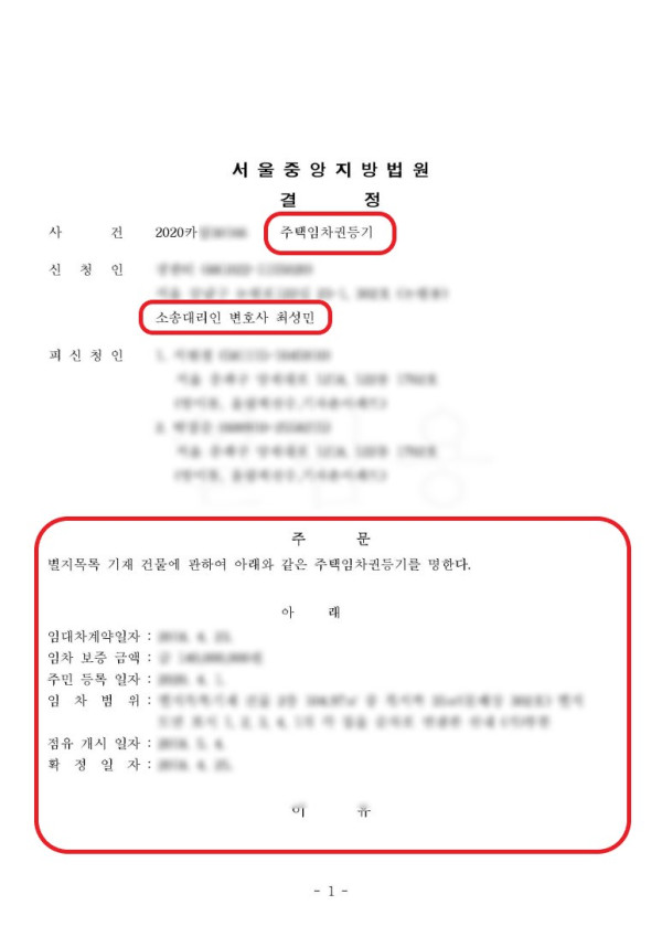 의뢰인께서 잘 알지 못하셔서 중간에 전입신고를 빼신 상황이었는데요. 다행히 임대차 계약 종료 전에 전입신고를 다시 하셔서 무리 없이 임차권등기명령을 신청한 후 결정을 받을 수 있었습니다.