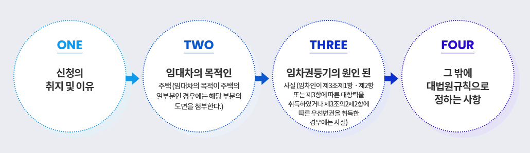 또한 임차권등기명령의 신청서에는 아래와 같은 사항을 기재해야 하며, 신청인은 신청의 이유와 임차권등기의 원인이 된 사실을 소명하여야 합니다.